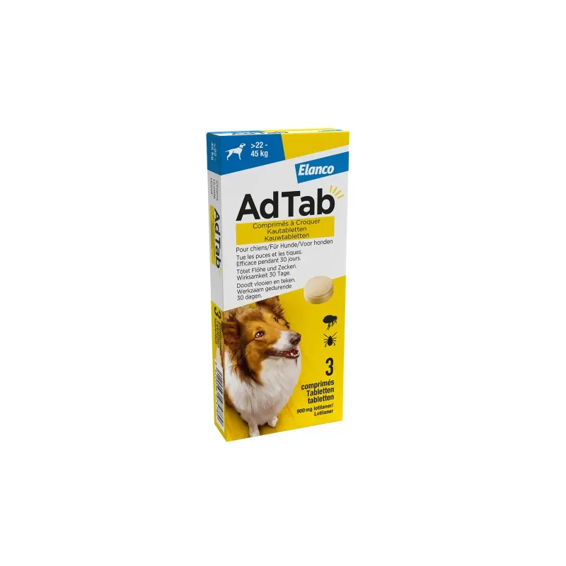 Traitement des infestations par les puces et les tiques chez les chiens. Ce médicament vétérinaire assure une activité insecticide sur les puces (Ctenocephalides felis et C. canis) et une activité acaricide sur les tiques (Rhipicephalus sanguineus, Ixodes ricinus, I. hexagonus et Dermacentor reticulatus) immédiate et persistante pendant 1 mois. Les puces et les tiques doivent s’être attachées à l’hôte et avoir commencé leur repas pour être exposées à la substance active. AdTab™ est un medicament vétérinaire. Lisez attentivement la notice.