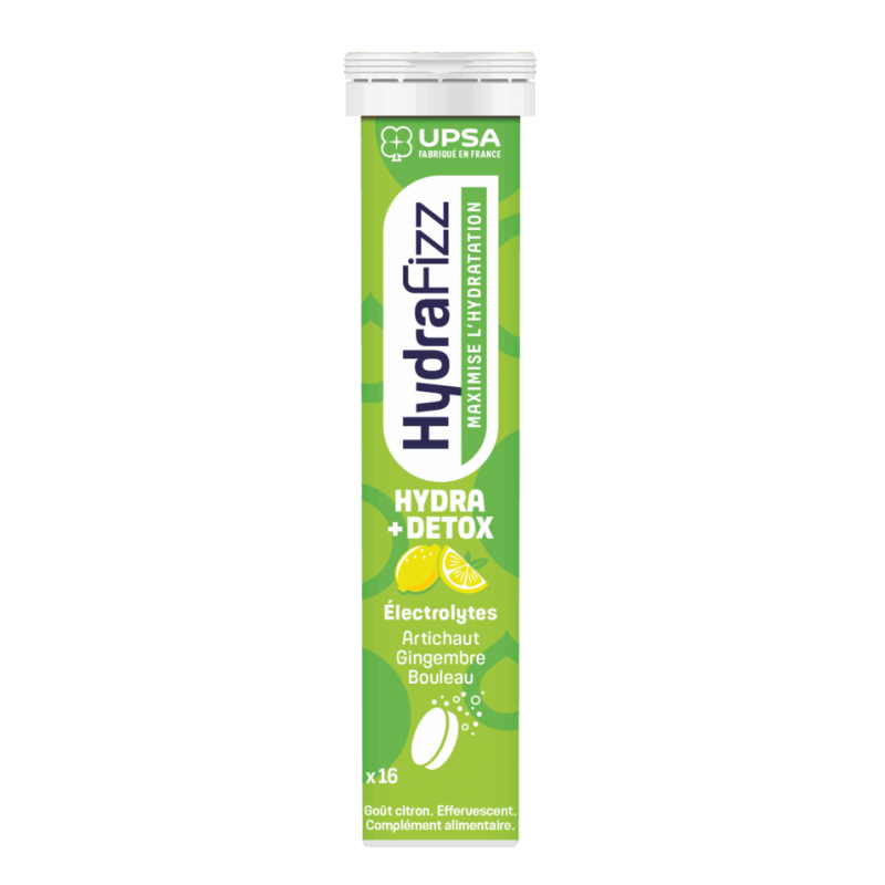 Hydrafizz Hydra + Détox combine des électrolytes essentiels à des extraits naturels d’artichaut, de gingembre et de bouleau, et de la vitamine C.