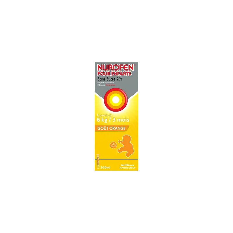 • Les autres composants de Nurofen pour Enfants sans sucre rouge 2% suspension buvable sont : polysorbate 80, glycérol, maltitol liquide, saccharine de sodium, acide citrique monohydrate, citrate de sodium, gomme xanthane, chlorure de sodium, aromatisant d'orange(contient du propylène glycol), bromure de domiphène, eau purifiée.