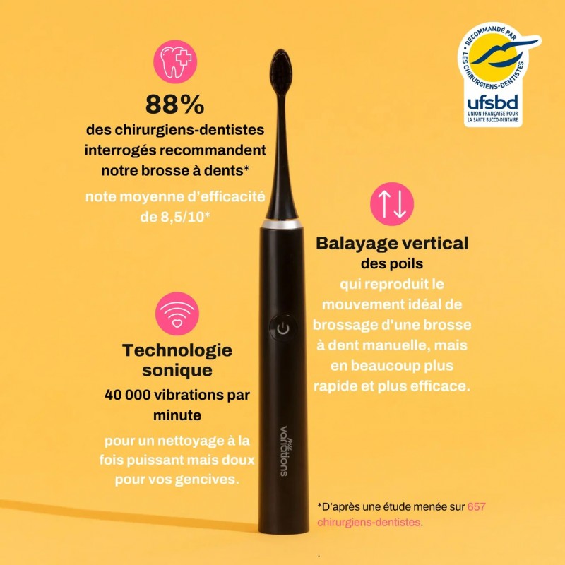 La brosse à dents électrique MyVariations est équipée de la technologie sonique qui vous offrira un nettoyage à la fois puissant et doux, grâce à ses 40 000 vibrations par minute.