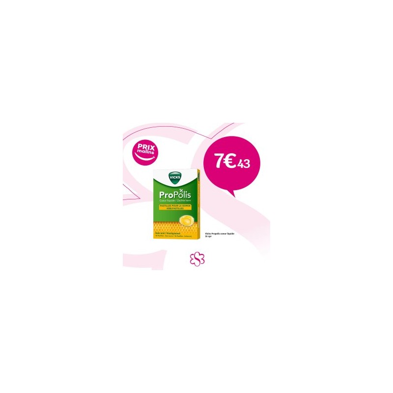 Les pastilles pour la gorge Vicks Propolis ont une double texture : la coque dure fond lentement pour augmenter la salivation et maintenir la gorge hydratée et le noyau liquide unique* concentré en propolis. Les pastilles ne contiennent pas de sucre et ont un goût de miel. Plus de 90% des consommateurs en apprécient le goût .