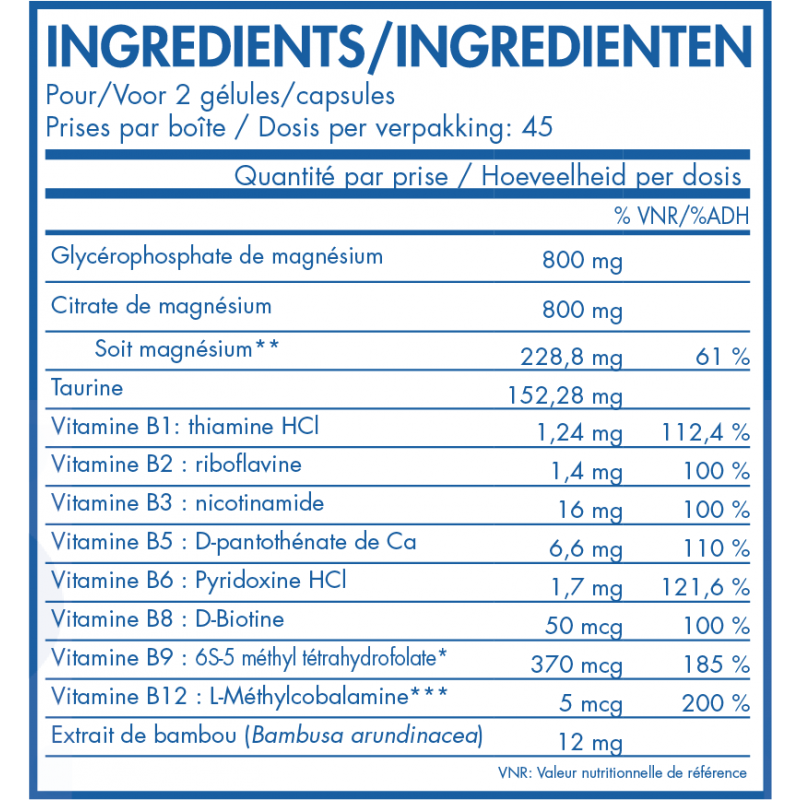 Le magnésium contribue à réduire la fatigue et à lutter contre le stress passager, à retrouver un métabolisme énergétique normal ainsi qu'un fonctionnement normal du système nerveux.