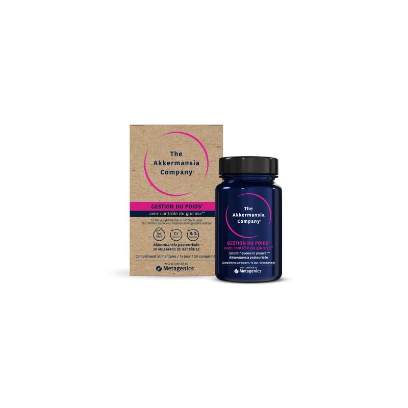 Complément alimentaire à base d'Akkermansia muciniphila, de thé vert, de chrome et de vitamines B2 et D3 sous forme de comprimés. Aide à contrôler le poids avec un taux de glycémie normal.