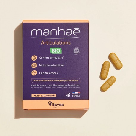 Manhaé Articulations BIO est un complément alimentaire, sa formule naturelle et BIO, développée pour les besoins des femmes, contient des actifs reconnus et plébiscités : extrait de curcuma, extrait d'harpagophytum, extrait de cassis, poudre de bardane, vitamine D issue d'extrait de lichen et extrait de cannelle.