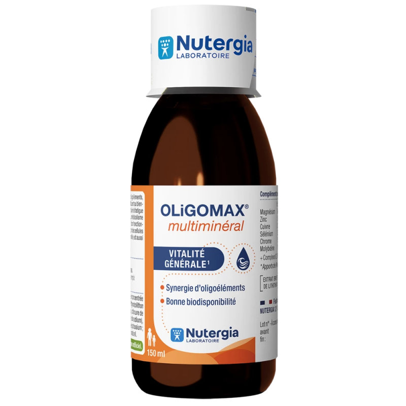 OLiGOMAX® multiminéral est une association complète d’oligoéléments, d’eau de mer désodée et d’extrait de lithothamne qui contribuent au bien-être général de l’organisme. Le magnésium contribue à réduire la fatigue ainsi qu’au fonctionnement normal du système nerveux et du métabolisme énergétique. Le cuivre et le zinc participent au maintien du bon fonctionnement du système immunitaire et le sélénium à la protection des cellules contre le stress oxydatif.