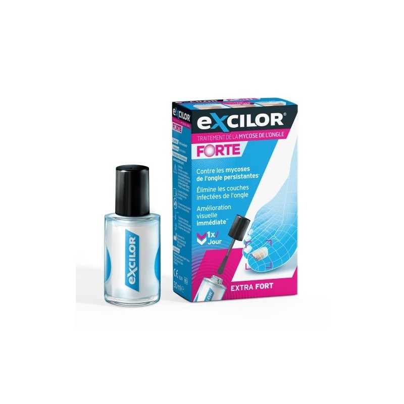 TRAITEMENT EXTRA FORT CONTRE LA MYCOSE DE L'ONGLE PERSISTANTE : Excilor® Forte abaisse le pH de l'ongle, inhibant ainsi la croissance de la mycose de l'ongle et favorisant une repousse saine tout en nourrissant la surface de l'ongle.