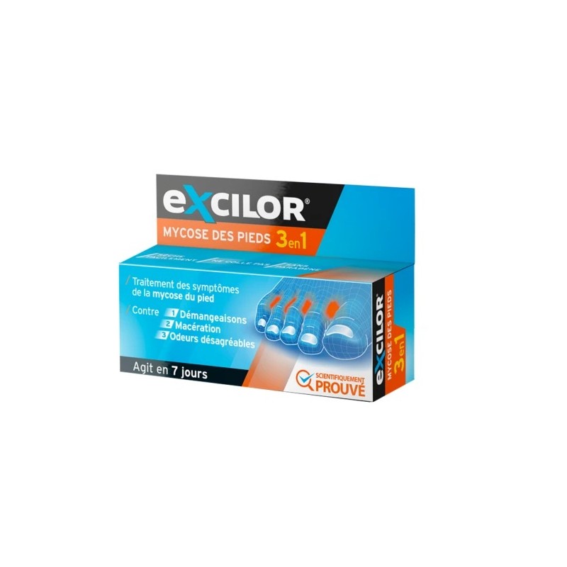 - EXCILOR MYCOSE DES PIEDS 3-en-1. Traite en 7 jours les 3 symptômes de la mycose des pieds : démangeaisons, macération, odeurs désagréables. Le produit, en plus de favoriser la guérison, crée un envrironnement hostile à la prolifération des champignons responsables de l'infection.