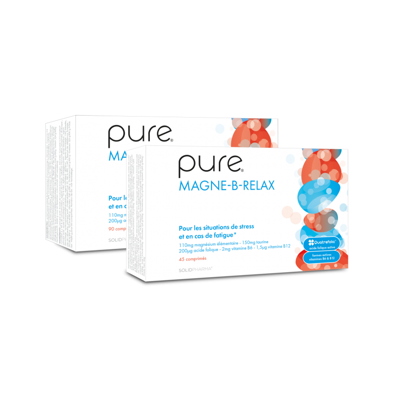 Pure Magne B Relax est un complexe synergique de glycérophosphate de magnésium, de taurine et de trois vitamines B essentielles (B12, acide folique et B6) sous des formes actives : pyridoxal-5-phosphate (B6), quatrefolique (B11) et méthylcobalamine (B12). Ces formes sont identiques aux vitamines de l’organisme et sont donc immédiatement biologiquement actives dans l’organisme. En revanche, les formes synthétiques inactives telles que la cyanocobalamine (pour la B12), le chlorhydrate de pyridoxine (pour la B6) et l’acide ptéroylmonoglutamique (pour la B11) doivent être transformées dans l’organisme avant d’être biologiquement actives.